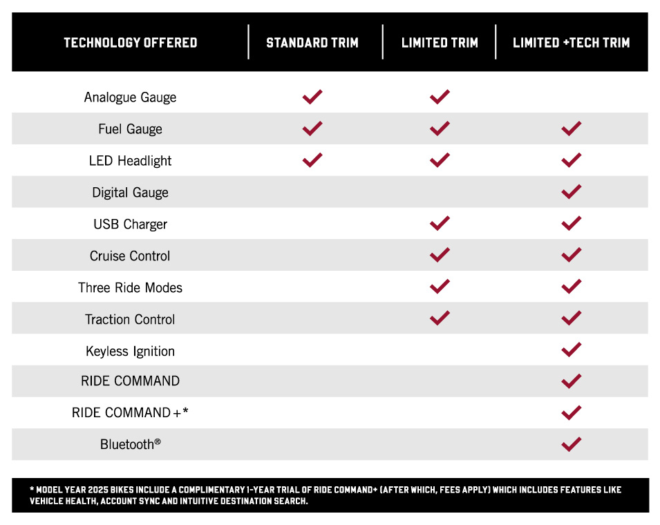 For those who demand more control over their ride, the Limited Trim gives riders everything from Standard Trim, but adds Cruise Control, Traction Control to provide confident, predictable handling in all conditions, three ride modes (Sport, Standard, or Tour) to maximize your thrills, and a USB Charger.